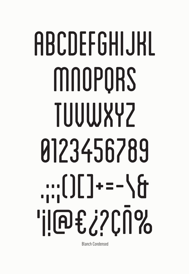 “This is a modular typeface family halfway between a 50s style sans serif and the range of numerical characters which most labelling machines use. These are seemingly contrasting concepts which lend themselves to the creation of an atypical font. The Blanch typeface family is comprised of 6 different font weights; 3 condensed weights and 3 caps weights. They are: Blanch condensed, Blanch condensed inline, Blanch condensed light, Blanch caps, Blanch caps inline, and Blanch caps light.”